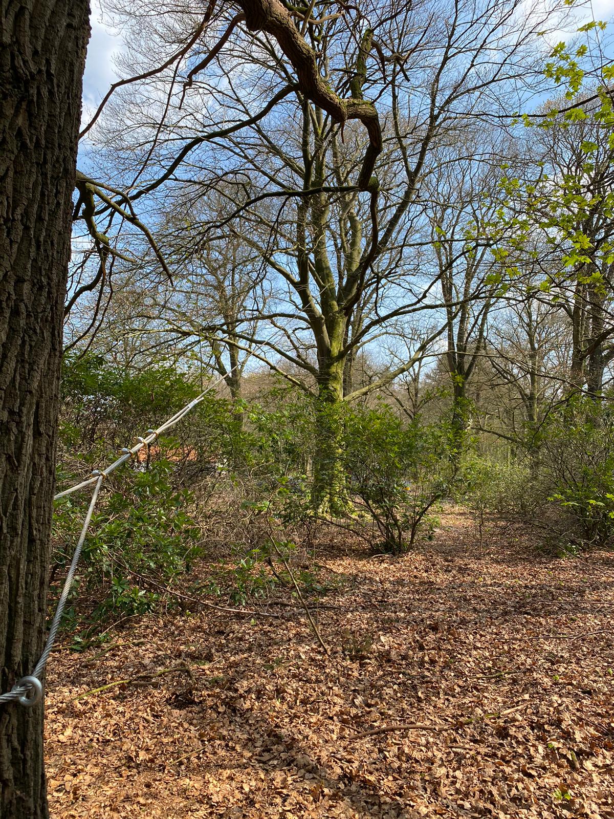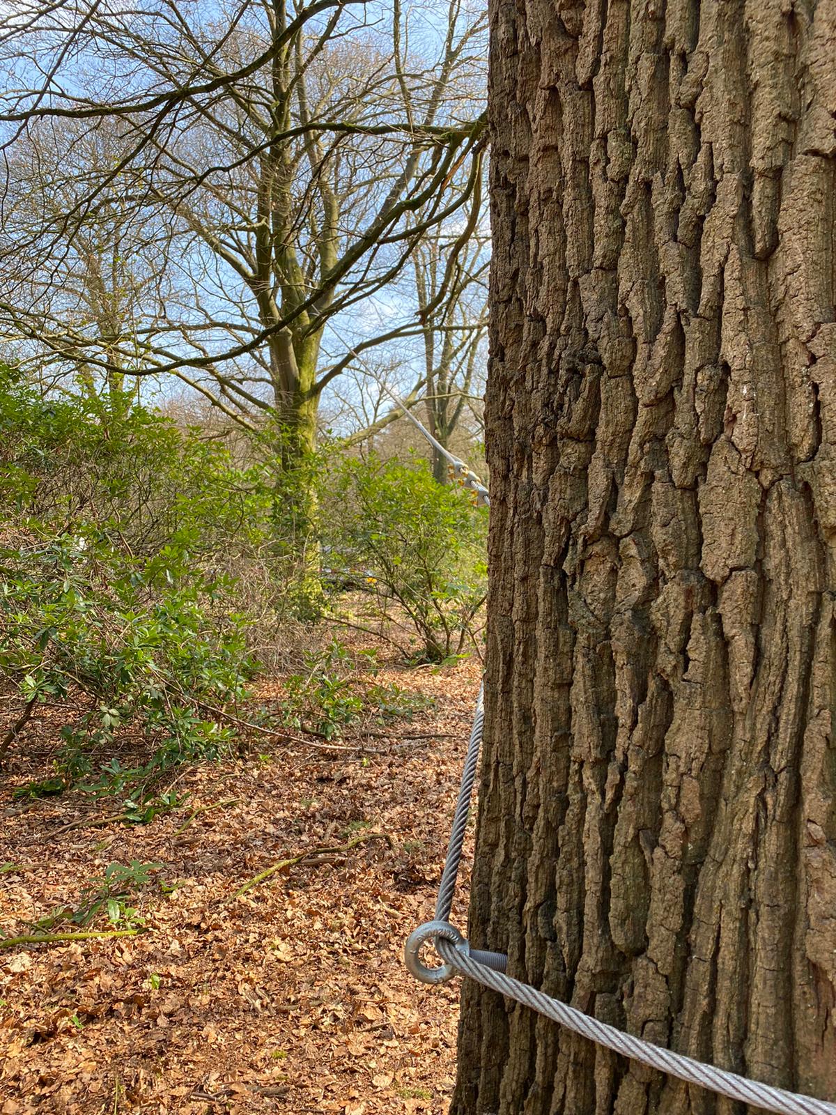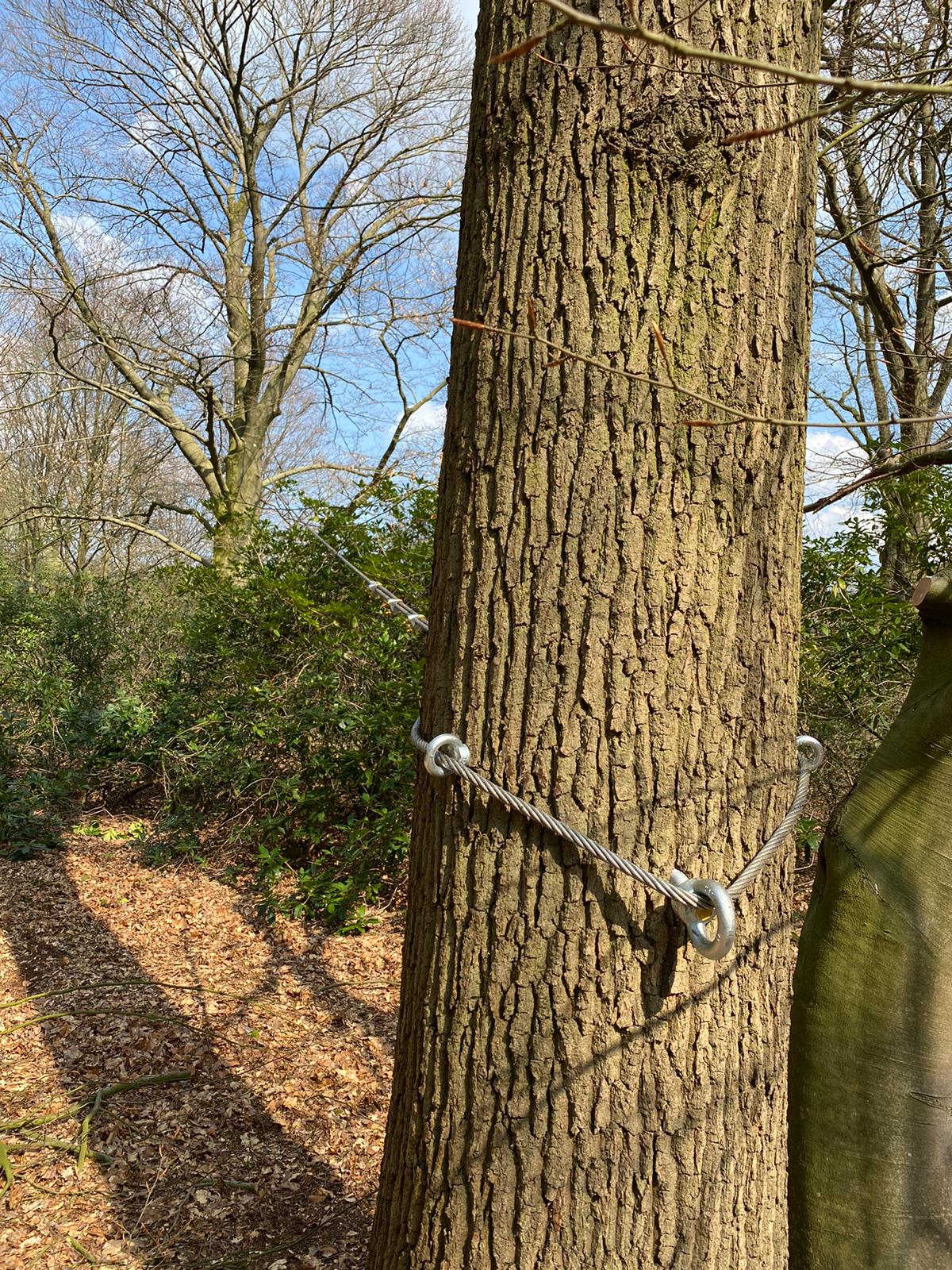 Boomtechnici hebben door middel van een constructie met staalkabels de boom aan omstaande bomen verankerd. Op deze manier is deze boom voorlopig behouden voor deze markante locatie.