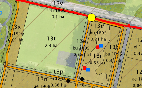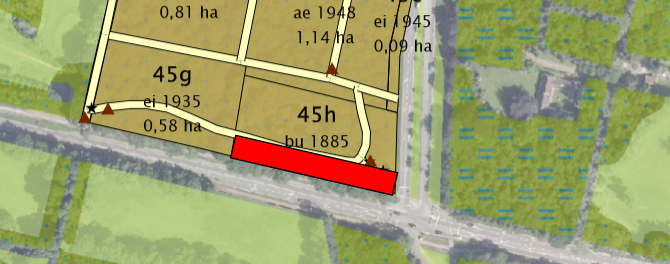 Direct aan de Bredaseweg staat een perceel met beuken (kaartje: rood aangegeven). Sinds de verbreding van de Bredaseweg, waarbij de bosrand is opgeschoven, is het beukenperceel in aftakeling geraakt. Afgelopen jaar is hier al preventief ingegrepen en zijn dode toppen uit de bomen gezaagd.